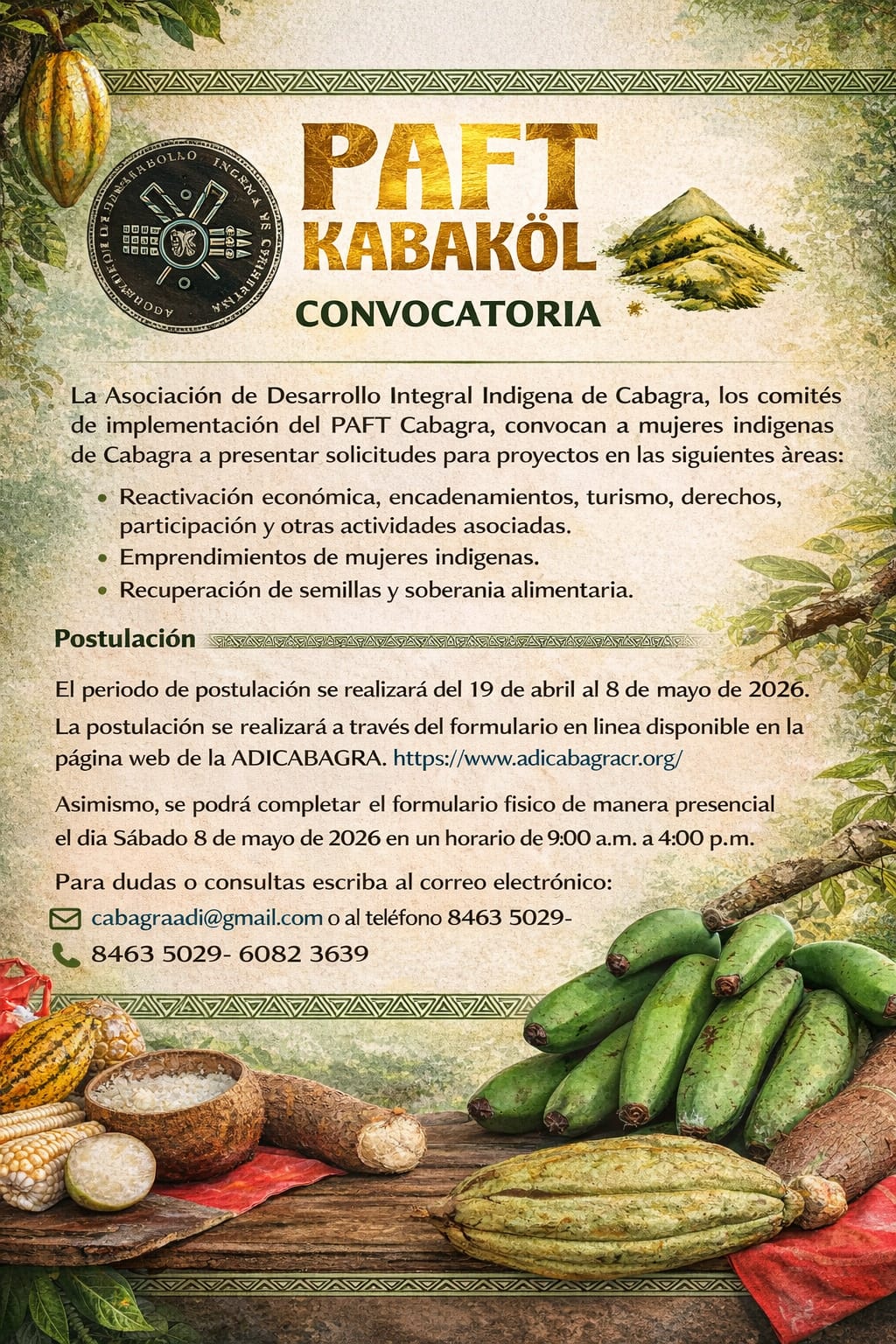 La Asociación de Desarrollo Integral Indígena de Cabagra, los Comités de Implementación del PAFT-CABAGRA, convocan a mujeres indígenas del Territorio Cabagra a presentar solicitudes para proyectos en las siguientes áreas: